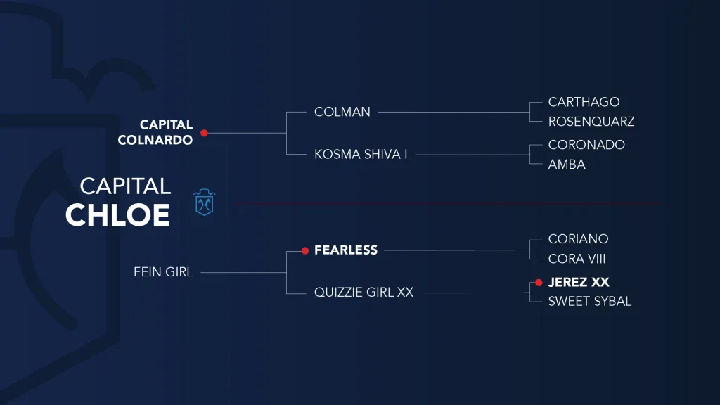 One of the most elegant daughters of Capital Colnardo, Capital Chloe is a petite, correct mare who consistently produces athletic, blood-type foals. Her dam, Fein Girl, brings in the light Thoroughbred Quizzie Girl XX. Chloe herself has already produced Capital Lydia and Capital Larkham, known for their sharpness and careful technique.
